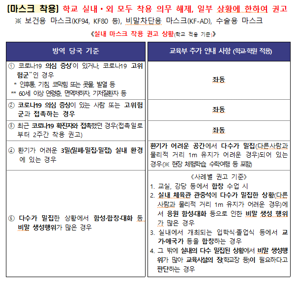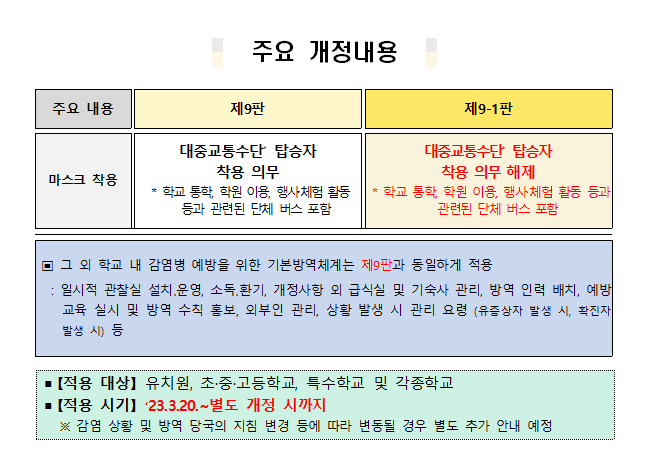 대중교통수단 내 탑승자의 마스크 착용 의무를 해제하는 마스크 착용 지침을 반영하여 「코로나19 관련 학교 방역 기본 대책(제9-1판)」이 다음과 같이 개정되었습니다. 이에 23. 3. 20.(월)부터 학교 방역관리도 변경되어 적용됨을 안내하오니, 학생의 건강한 학교생활을 위해 감염병 예방 관리에 적극 협조 부탁드립니다. 감사합니다.